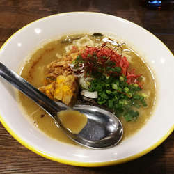 トッピングの豚マシは残念ながら売り切れ。二郎系ラーメンに旨辛系麻婆豆腐がのった「フュージョン」(750円)を無料トッピングはヤサイニンニクアブラでいただいた。よく乳化した豚の美味さが濃縮されたスープ。麻婆の辛さは本家よりは控えめで程よい爽やかな辛さ。麺は自家製の縦切り平らな太麺縮れ麺。トッピングのアブラは大粒でプルンプルン。豚も厚みあり柔らかでうまい。量は二郎系としては少なめ。辛味と豚の旨味・脂ががあわさってジャンクでクセになる旨さの一杯であった。