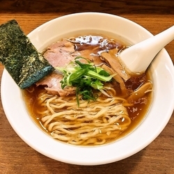 まずは、最近裏メニューで始めた「金目鯛らーめん」1500円。そういや、店内のどこにも書いてなかった。こちらは清湯で細麺。ここの塩ラーメンは「黄金の塩らーめん」820円として提供しており、自信作の一つのようだ。それをベースに使いながらも金目鯛の旨味を加え、チャーシュー替わりに金目鯛がのっている。実に贅沢な一杯。洋食経験も和食の経験もある店主だからこそできる限定メニューと言えよう。実に美味しい。