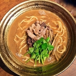 河原さんに聞いたら「イタリアのボンゴレと博多のチャンポンを融合させたイメージ」とのこと。食べてみるとまさにその通り。「とんこつスープ」「和出汁」「ボンゴレスープ」をブレンドさせ、首都圏では有りそうで無いタイプのラーメンに仕上げている。