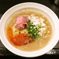 店主一人で全てこなしているため、少々時間がかての登場。ジュレ状態のトロミあるスープは脂を除いて冷やして固めた鶏清湯スープ。合わせる麺は三河屋製麺の細ストレート麺。箸ですくいあげるとジュレでテカテカとコーティングされたような見た目。麺がジュレとよく絡むので控えめの味付けながら十分に鶏の旨みが感じられ実に旨い。昆布だしと白醤油、かぼす果汁でのばしたというとろろ芋と絡めていただいても旨い。具材はスライススした赤タマネギの上にセロリと大根のピクルスがのっており甘酸っぱさが熱い季節にピッタリ。そして低温調理の鶏チャーシュー。しっとりと上質なハムに近い状態でこちらは塩気があり良いアクセントとなっている。