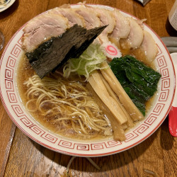 トッピング2個券買って選んだトッピングはバラチャーシューとワンタン。デフォはねぎも載らない本当に麺とスープのみなんですね。ワンタンは小ぶりながら肉餡がミッシリ詰まって3個130円とお得。チャーシュー大きめですが、少し切り置き感あったのが惜しい。
