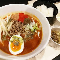 トッピングは浅利と玉葱の真薯揚げ、あかざら貝、トマトサルサソース、鰹出汁たっぷりの穂先メンマ、九条ネギ、チャーシューは豚ロースを塩、タイム、セージでマリネし、低温調理。これを2枚巻いて提供。その上にはグリーンタプナード。そして特製用は味玉、帆立雲呑2個がプラス。軽めのコース料理を食べているかのよう。