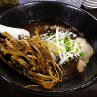 「名代玉子入手打そば」と看板に書かれているこの麺に特徴があり、「二郎並にワシワシゴワゴワ麺」などとも言われる極太ちぢれ麺。これは自家製なのか製麺所製なのか。二郎とは随分違った麺ではあるが、その太さ、縮れ、インパクトは相当なもの。