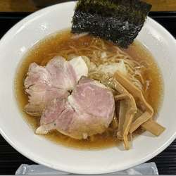 醤油の色がうっすらとついてあっさりしたスープは、鶏をメインにしつつ豚の味も漂っている。旨みがしっかりと入っていて物足りなさはなく、中太麺をスズっと、テンポよく啜らせる。少しずつのっている青菜やワカメで舌をリフレッシュさせながら、中心の煮豚チャーシューに箸を伸ばす。ホロホロとした触り心地で、口に入れるとスープが染みた肉の味を堪能できて、オーソドックスだが実直に作られた一杯になっている。