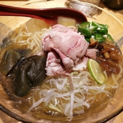 「鯛塩らーめん 全部入り」(1050円)と「スープ炊きチャーシューおこわ」(200円)をいただいた。一口目、鯛の旨味風味強し!!少しビターでほのかなエグミがあるが食べ進めていくうちにすぐに慣れる。油感もしっかりあり、「鯛塩ラーメン」というとなんとなく上品なイメージがあるがこちらはワイルドでほどよくジャンクな味付け。あわせるもちもちの極太縮れ麺がこれまたうまい。チャーシューやわらかほろほろ脂身。刻み玉ねぎはさわやか。三角形状のメンマは甘みありシャクシャクの歯応え。