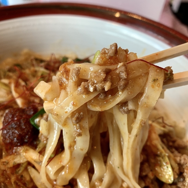東京都目黒区中央町1-17-12マップで見る紅黒胡麻担担麺の動物清湯Wスープにコクの深い黒胡麻と辣油と肉味噌がたっぷり入ったスープは濃厚で麺にしっかり絡む。麺は加水やや高目の中細ウェブ麺でもっちり弾力。辛痺は穏やかでナッツも干し海老も旨し。
