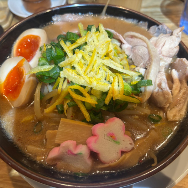 宮城県仙台市青葉区中央2-6-34マップで見るらーめん小のニンニク&カラメ&ラー油マシに裏麺ゴリゴリの乳化した豚骨白湯出汁に濃目のカエシで出来たスープは豚の旨味ガッツリ。麺は全粒粉入低下水中太手揉麺でその名の通りのゴリゴリで旨し。