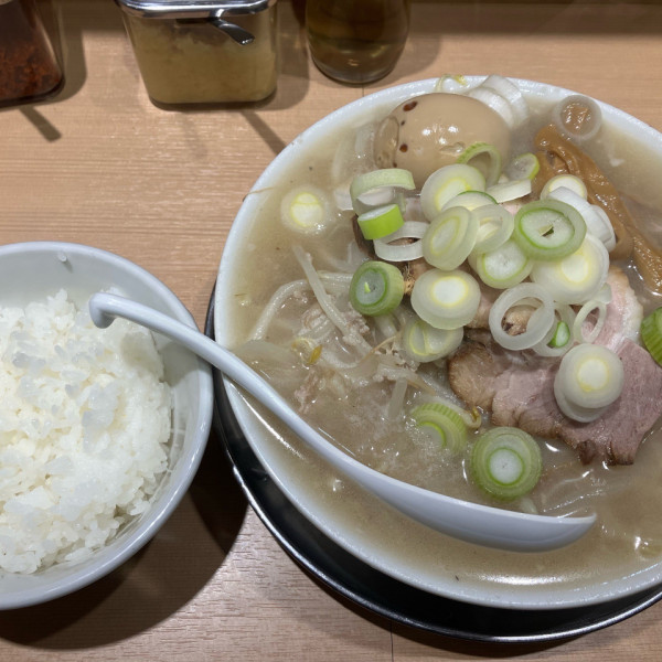 豚や鶏をじっくり炊き上げた濃厚動物系スープと鯖節や鰹節を使った風味豊かな魚介スープを合わせた一杯が味わえる。自家製の中太麺には数種類のモンゴル産のかんすいを使用している。極太のメンマは食感にも視覚にもインパクト大。