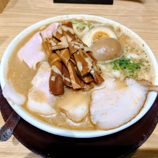 東京都千代田区丸の内1-9-1 東京駅一番街 B1Fマップで見るこいくちの超ド濃煮干出汁のシャバ系スープは煮干粉もガッツリで甘味が強くこれぞ津軽の味。麺は加水やや高目の中太ウェブ麺でスープと相性抜群なもちもち食感。デフォでもチャー大量で旨し。