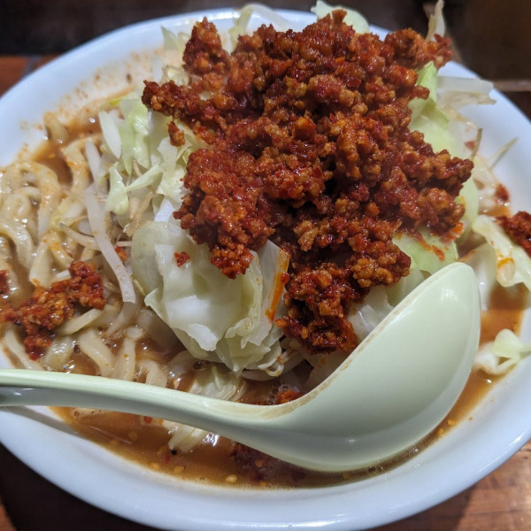 上野に本店がある。二郎風のラーメンで、極太麺。ボリューム満点。豚は軽く崩れる感触の柔らかさ。食券を渡すときにヤサイ、ニンニクの有無、スープの濃さ、脂の量と伝えるシステム。