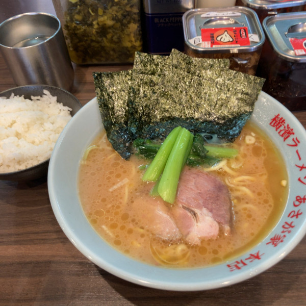 東京都杉並区阿佐ヶ谷北1-26-5マップで見るラーメン並の硬目多目濃目にライスの豚骨清湯出汁に濃厚カエシのスープは法連草をやけに際立たせる。麺は加水高目の中太スト麺でしっかり歯応え。卓上辣油と高菜漬をライスに乗せてスープに浸した海苔で巻いてとても旨し。