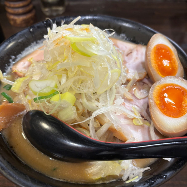 東京都豊島区東池袋1-23-8 東池袋ISKビルマップで見る野菜とニンニク増量可。スープは味噌感あり、こってりだがまくれる。麺は三河屋製麺の黄色味がかった中太短め。チャーシューは薄めだが大きくホロホロ。野菜はタマネギ、モヤシが柔らかく炒めてあるものとシャキシャキネギ。