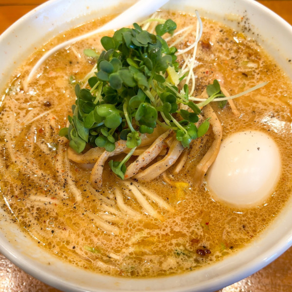 東京都豊島区西池袋3-30-2 フェリース西池袋1Fマップで見るIWGP激辛ラーメンにトピで生たまごと辛子たまごの豚骨白湯出汁に野菜と味噌と背脂の旨味が三位一体のスープは塩味強目で溶き卵が合う。麺は加水高目太スト卵麺でもちもち弾力。ピリうずらもホロチャーもシャキシャキもやし