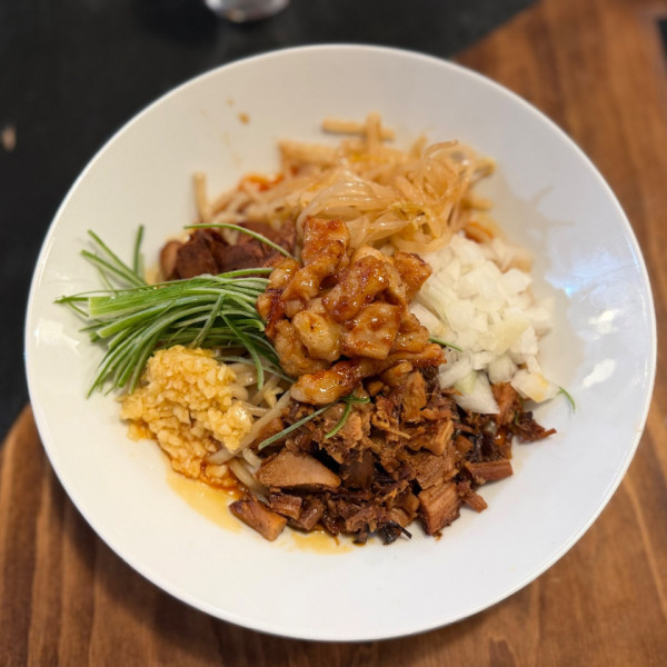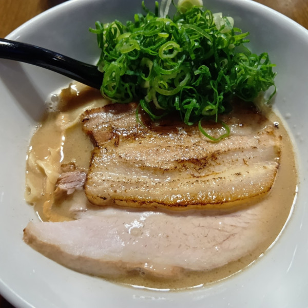 鶏ガラと豚骨+魚介、香味野菜をじっくり炊き出したスープ。麺は自家製の中太麺。どこか懐かしい魚介系ラーメン。