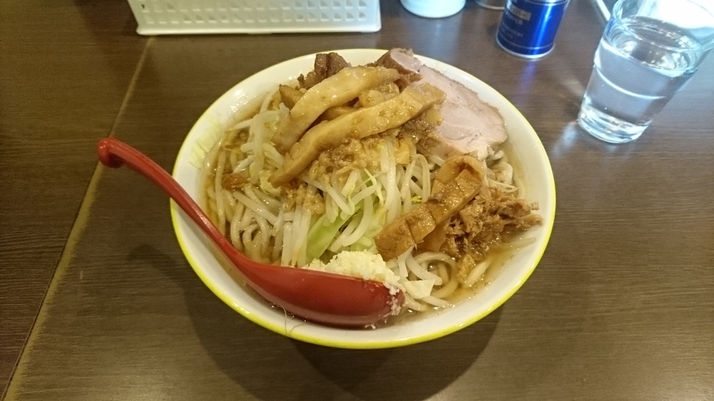 秋葉原周辺で何か目新しい店は無いかと探したうえで、訪れたのがここ。ちなみにここは新潟にあるJインスパイア系の支店で、店主は二郎高田馬場出身……らしいです。自分は残念ながら高田馬場二郎には行った事が無いので、比較は出来ないですが。で、注文。デフォでも豚が結構多いらしいので、『ラーメン並+ニンニクアブラマシ』にしました。https://cdn-ak2.f.st-hatena.com/images/fotolife/s/sho34141991/20171124/20171124225154.jpgなるほど結構デフォでも豚が大きい感じ。本家を合わせても結構大きい方かな?麺は中太麺。インスパによくあるワシワシしたものではなく、ストレートな物。店にもよると思いますが、本家の固め位でしょうか?個人的には結構好き。スープは醤油が強い非乳化系。後アブラマシに関係なくかなりオイリーな感じ。そんなに嫌いじゃないけど、これは若干余計、というか好みがわかれるところかも。上に乗っかっている背油は浮いているのと別物で、こっちは美味しいので、その辺りの調整が出来るともっといい、ハズ。豚は二枚。ただかなり大きめの物で、固さも程よい感じ。やや塩気が強めだけど、この辺りは好みの範疇。野菜はもやし多めのクタ系。コール無しでこれなので、そこまで暴力的な盛りになることはないかなぁ…という按配。全体的に、醤油感の強い普通のインスパ系という感じ。ただ、この辺りだと、近い系統のインスパは『らーめん忍者』位で、それよりは高品質だと思うので、一つの選択肢にはなり得そうな気配。値段が強気なのは豚がデフォでも結構多い事で相殺出来るとしても、デフォでもオイリーなスープと、対象的に美味な追加の油をうまい事チューニングできるのなら、更に印象は上がるんですけどね。御馳走様でした。http://sho34141991.hatenablog.com/entry/2017/11/29/000000