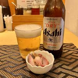 まず出されたのは、アサヒスーパードライの小瓶と冷えたカップ。