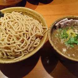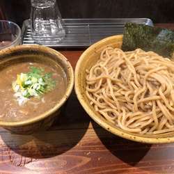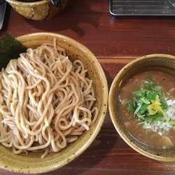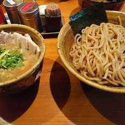 近くを通ることがあったので、なんだかレビューの多い当店に行って見ました。 少しわかりにくい場所にありますね、まぁ・・一度行けば覚えますが。 つけ麺で、無料の大盛りをオーダー。 妻は普通のラーメンを。 ラーメンが先に到着して少し食す。 その後つけ麺が到着、最近、流行ってるんでしょうか、ドロドロのスープが登場です。 まずくはありませんが、いつか食べた味ですね、神田の北かまとかもこんな感じじゃ? 味はしっかりありますが、煮詰めてしまうスープと言うのは、やはり風味が足りません。 スープは6時間をピークに酸化しますから、そのバランスなのでしょうけど、 ベーススープとは別に、フレッシュなスープを追加すると良いかも知れません。 想像よりは普通な(良く言えばトレンドを抑えた)ラーメン、評価目で79点。 新しいメニュー等があればまた来るかも?、ご馳走さまでした。