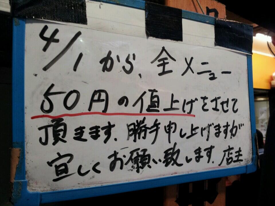 4/1から全メニュー50円ずつ値上げです。小ラーメンが700円、大ダブルは1000円になりました。