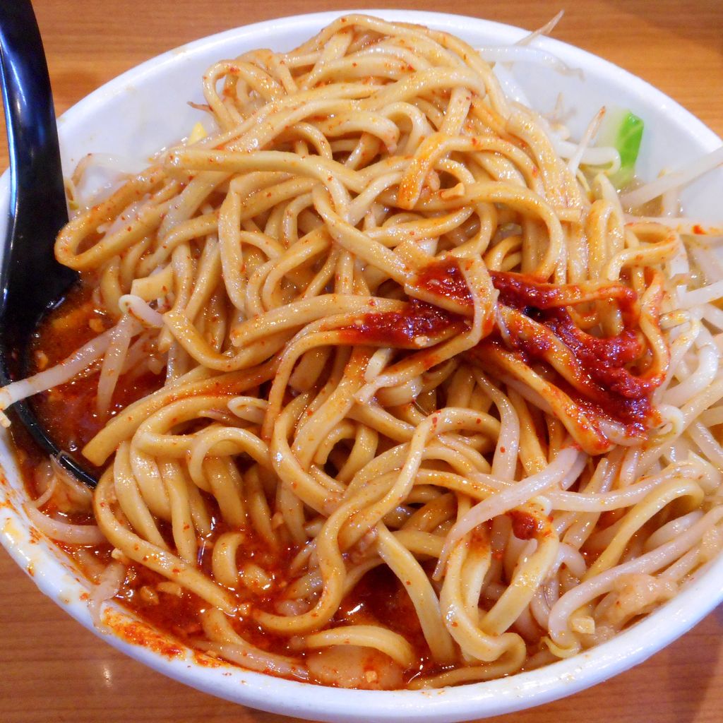 ノーコールながらそこそこのヤサイ山。豚は脂の乗った厚手のものが2枚。丼の縁内側にへばり付く真っ赤なペーストがちょっと恐ろしいw