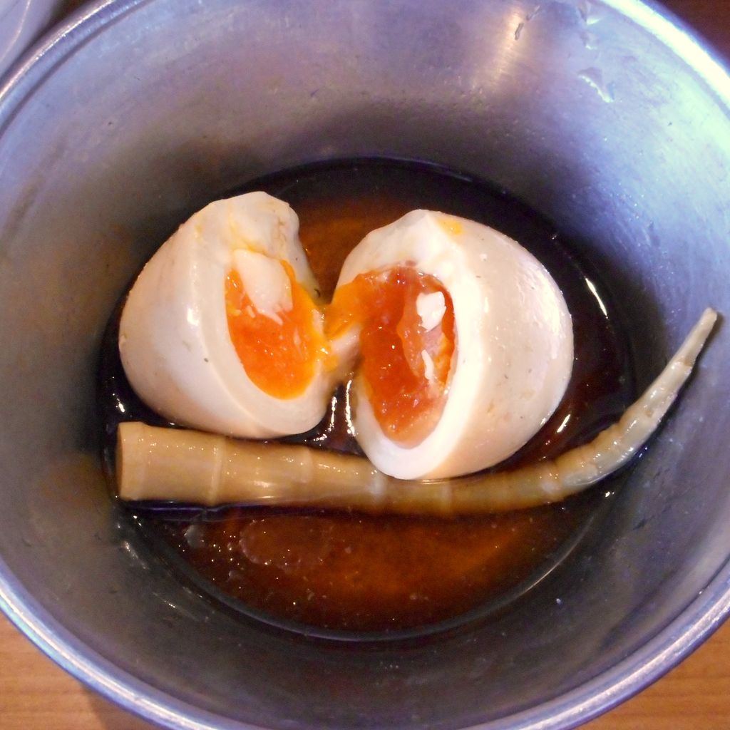 開店時、入口でつけ麺(880円)と缶ビール(300円)の食券を購入し、奥から2番目に着席。食券に100円玉を添えて高台に置き、きまぐれたまごをオーダー。この日は「タケノコ卵」。たまごとタケノコの先っちょが小ステンボウルに入れられ、缶ビールとともに配膳されました。