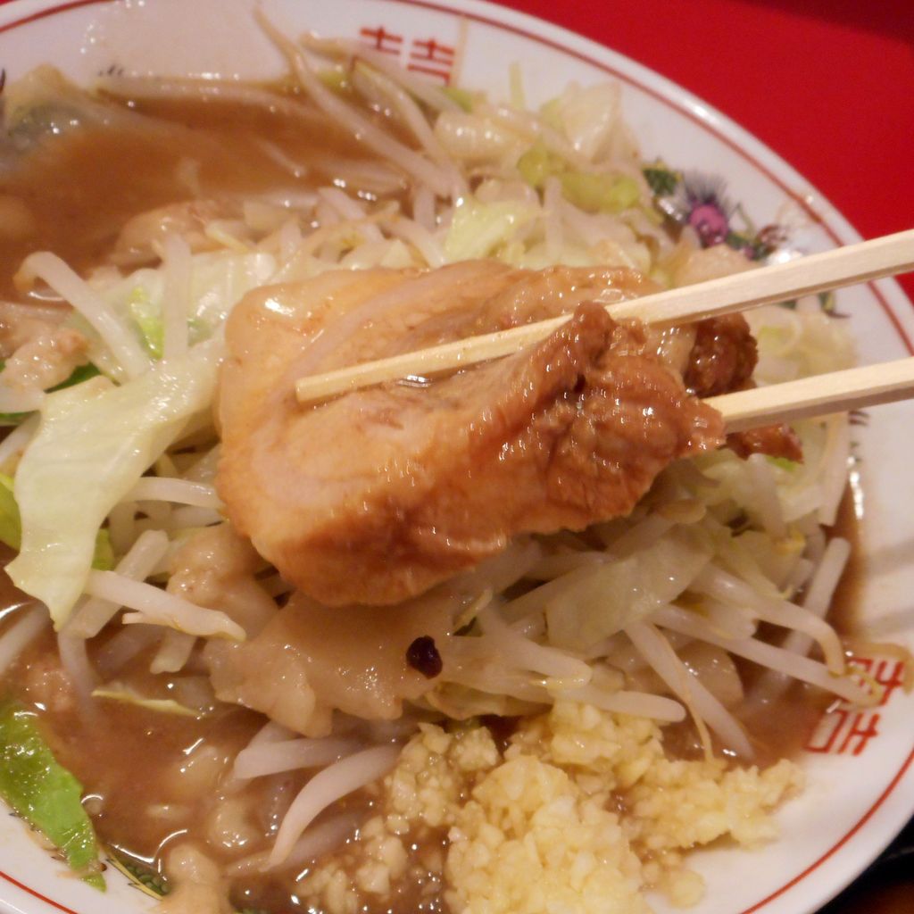 麺は、縮れというより捻りの強い極太麺。同じサイズの麺でも、新代田店のしなやかさを持つものではなく、府中二郎や蓮爾の密度の高そうな剛麺タイプ。両店同様、ちくわぶみたいな硬い食感を持つもの。でも、このトロンと粘度の高いスープとのマッチングは相当良いですよ。