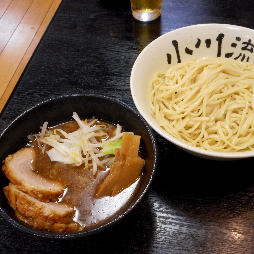 帰宅時の自宅最寄り駅前。雨なので学校が休みの息子がクルマで迎えに来てくれました。こういうときは、実は、何か食べに行こうという合図なのですw で、クルマでひとっ走りのコチラへww8時前に入店すると、雨模様のせいか先客1組のみ。私はらーめん 中(690円)とビール 中瓶(500円)、息子はつけ麺半ちゃーしゅー 大(930円)の食券をポチって着席します。チャーシューは、肩ロースとバラから選べるので、私は肩ロース、息子はバラ肉をチョイス。ココはカウンター以外は靴を脱いで上がる座敷なので、腰を落ち着けるとついついビールを飲みたくなっちゃいますねw 条件反射wwビールで喉を潤しながら待つこと7~8分、私のらーめん、そして息子のつけ麺の順に一杯が配膳。店名を縁にあしらったベーシックな反り丼には、茶濁したスープ。中盛の麺が水面上に顔を出し、その上には大判の肩ロースチャーシューが1枚、軽くモヤシとキャベツにメンマ。http://livedoor.blogimg.jp/nsashi55/imgs/7/6/76dd5d7c.jpg息子のつけ麺半ちゃーしゅーの方は、肩ロースより一回りサイズの小さいバラロールですが、充分に厚みのあるものが3枚。ココのバラチャーシューはホロットロで美味しいんです。それなりに定評もあります。では自分のらーめんの方を実食。強火で炊いた豚骨と魚介系を合わせたベースに、少し甘みのある醤油ダレを合わせたいわゆる豚魚スープ。中には魚粉も投入されており、謳い文句にある煮干よりは鰹節系の風味が先行している印象かな。よくある味なんだけど、美味しいです。麺は、緩やかなウェーブの中太麺。多少平打ち気味なんですが、以前に比べると少し細くなったような印象。それほど粘度の高いスープではないので、これくらいの番手の方が相性が良いかも知れません。ほどほどにコシがあって、喉ごしも良いバランスのとれた麺だと思います。さてチャーシュー。コチラで肩ロースを選択するのは2度目。ずっと定評のあるバラばかりチョイスしていたのですが、あるとき気が向いて肩ロースを食べてみると、バラに負けず劣らず美味。この日も、バラチャーシュー並に厚みもあり、かつ肉々しい旨みが味わえました。終盤、卓上の刻みニンニクをレンゲに軽く取り、スープに溶いてブーストアップ。麺をガシガシと掻き込み、チャーシューを含む固形物をサルベージ後、スープを8割方飲んで終了。いわゆる豚骨魚介系のよくあるタイプなんですが、今のところ食べにきて外したことはありませんし、お店自体、県北から町田のローカルで真面目に経営している印象があります。なお、このグループで、ラーメン、つけ麺ともに麺中盛から大盛まで無料なのは、この「小川流」だけなので、量食べたい人にはうってつけだなと感じた一杯でした。