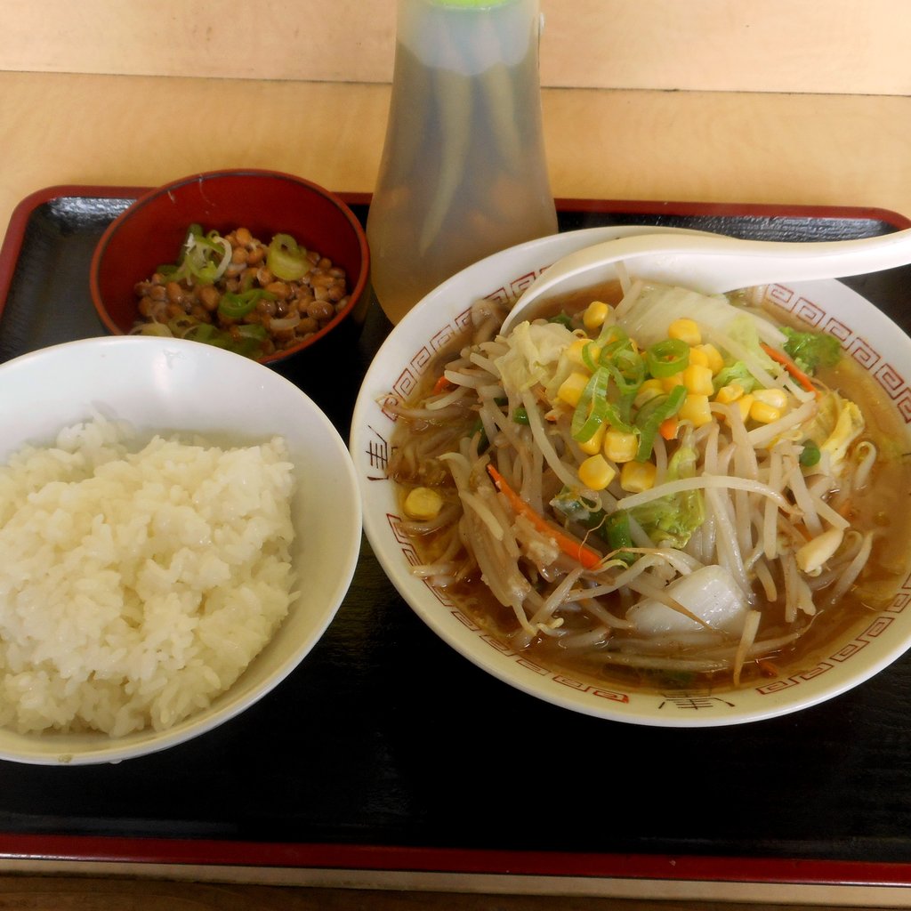 麺は、コンベンショナルな町中華の中細縮れ麺だけど、扱いが上手いのか、ダレもせずスープ・野菜とマッチしていてなかなかいい。麺量は標準量程度ですが、野菜のボリュームと相俟って全体量はなかなかのもの。納豆ごはんに行く前に、せめて味噌汁程度にまで麺と野菜を減らしておかないとw