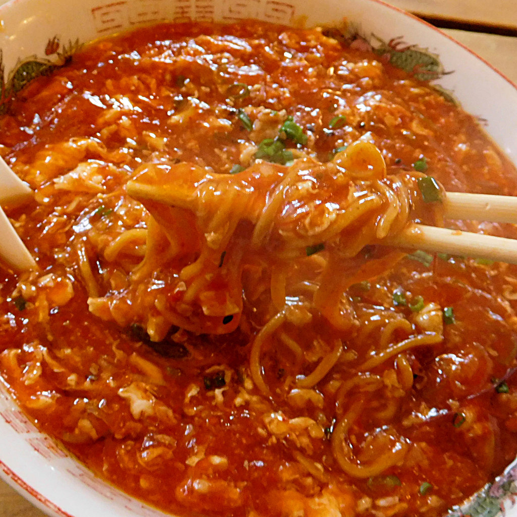 スープは、もはやスープと呼べないくらいの高粘度な餡。硬めの四川麻婆豆腐くらいの粘度がある感じ。餡の中身は溶き卵と豚挽肉。中華鍋で合わせて炒め調理をしたものみたいです。レンゲにとって口に運ぶと、唐辛子独特の香りと、ほどよくニンニクの利いた自然な甘みが口に広がり旨味たっぷり。同時にじわっと辛味が支配を拡大。自分基準ではこれ中辛以上です。でもこの辛さでスイッチが入った感じで美味しい。