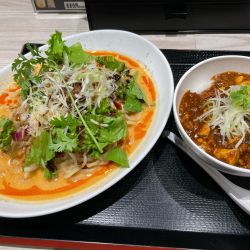ということで注文は冷やし担々麺のどんぶりセット。職場の健康診断終わりでお腹が空いていたので、がっつり食べることにしました。
