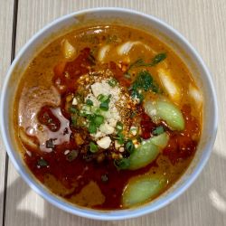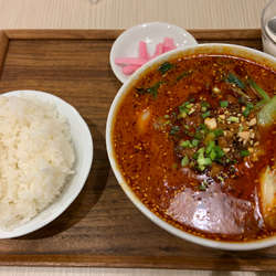 スープは、辣油タップリで真っ赤。迫力の感じられるヴィジュアルだ。