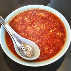 スープは清湯ベースだが、強い赤みを帯びている。表面には多めの唐辛子粉も。