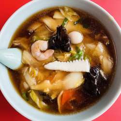 厚めの油膜に一味が多め、一番に塩分と辛味が来る、動物系の甘味が軽く追いかけ、香味油に貝柱かな!?な魚介感。