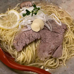 チャーシューも牛肉。薄切りレモンとニンニクスライスが2枚が味のアクセント。絶妙なバランス。スープはコクがありながらあっさりスープ。飲みやすい。麺は細麺ストレートで歯応えあり。全体のバランスが良く久しぶりにスープ完飲してしまった。また食べたいと思わせる一杯であった。