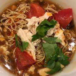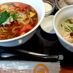 | メニュー | メニューの写真を見る 蒸し鶏ときのこのサンラー麺820円 |