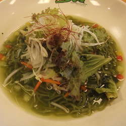 道の駅八王子滝山内に併設されたフードコート。本メニューは、八王子市制100周年を記念したものだそうで、桑の葉の粉末を麺とスープに使用しているとのこと。