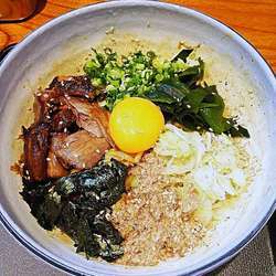 18/2/7訪問。過去分ですが、閉店しているので、足跡を残させていただきます。マグロラーメン 醤油(850円)を。スープは、濃い醤油色をしていて、見た目通り、醤油が牽引するバランス。無化調なのが、分かりやすい。麺は、かんすい不使用だそう。ぱつっとしたストレート細麺。具は、かいわれ・ワカメ・ちくわ・玉子半身・マグロのカマが二つ。なかなか個性的な一杯でした。
