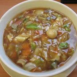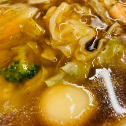 あっさりめで少し甘みのある醤油スープにたっぷりの具材を含んだ餡かけがトッピされているもので、餡の味付けは老若男女に配慮しているのか、味わい濃すぎず、広く受け入れられそう。全体的に穏やかで尖りのないスープ。塩分濃度は丁度良い。