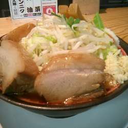 日曜日の昼過ぎにおじゃましました。つけ麺がなかったので油そばにしました。濃厚な醤油豚骨のつけ汁を麺に混ぜているのでしょうか?野菜、背脂多め、ニンニク普通で頂きました。太麺で食べ甲斐はあります。大変美味しく頂きました。ごちそう様でした。