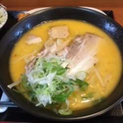 ややウェーブした中太麺にチャーシュー2枚。半味玉、モヤシ、玉ねぎにチーズと粉チーズ。