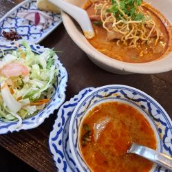 東京・神保町にあるタイ料理レストラン「ムアン・タイ」にランチでお邪魔しました。古民家をきれいに改装し、コの字のカウンターが印象的です。ランチメニューの中から、カオソーイを注文しました。