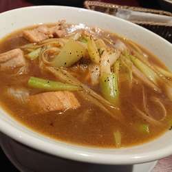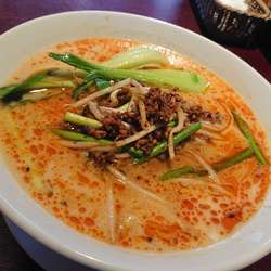 濃いめの味付けで、甜麺醤で味付けられた挽肉ともやし、ニンニクの芽、青梗菜がトッピングされます。酸味も程よくきいた龍鳳閣オリジナルの担々麺です。