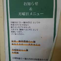 | 備考 | 月曜日のみの「岡谷らー麺 mossaおぱち」とは違ったコンセプト(横浜家系)の店 |