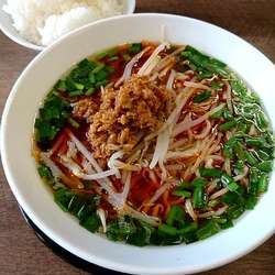 20/4/22訪問。過去分ですが、閉店しているので、足跡を残させていただきます。担々麺(760円)を。スープは、適度な辛さで、まろやかな口当たり。卓上のラー油・すり胡麻が良く合う。麺は、柔らかめのストレート細麺。具は、ネギ・もやし・挽肉。終日、ライス無料のよう。CP、良いです。武骨家は横浜家系ラーメン 武骨家 本八幡店以来の訪問でした。