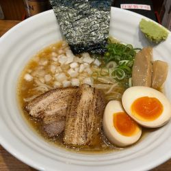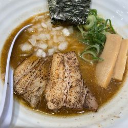 濃厚煮干しそば 950円。平日11時40分空席1、カウンターのみ5席。5年ぶり。袋入り割り箸。約10分後着丼。海苔2枚、太メンマ2、厚くはないが5mm厚の炙りチャーシュー2枚、刻みタマネギ。ストレート麺は気持ち柔め。煮干し濃厚とはいうもののセメント感の無い茶濁スープは油層あり粉感あり、絶妙な遠さで唐辛子がいる。この季節に嬉しい熱々。煮干しの苦味は無く逆に物足りないかも。食後唇が... 続きを見る