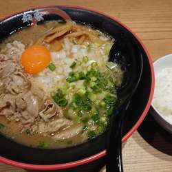 具は豚バラ肉、卵黄、メンマ、刻み玉ねぎ、ネギです。