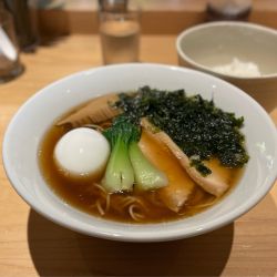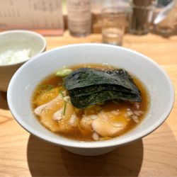 この日は先日初めて来たら美味しかった、新橋から銀座に向かうエリアの地下にあるオシャレなバーで、平日昼にだけ杯数限定でラーメンを提供するという【裏庭ラーメン】に2週連続で行き、前回は中太麺を食べたので今回は≪裏庭ラーメン・細麺≫をいただきました🍜