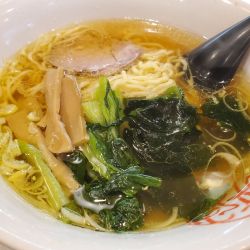 【注文】にぼしラーメン(780円)+チャーシュー1枚(100円)。元々、塩ラーメン狙いでここへ来たのだが、標題のメニューを見かけて急遽変更。無料で大盛にも変更可能だが、普通盛りのままで注文する。