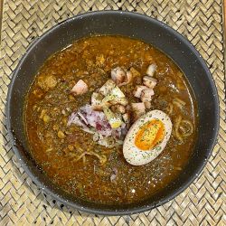 底の浅い器で登場、汁多めなまぜそば風と勝手解釈。