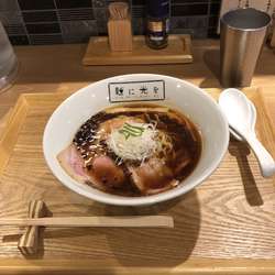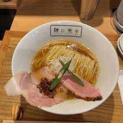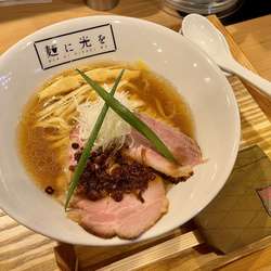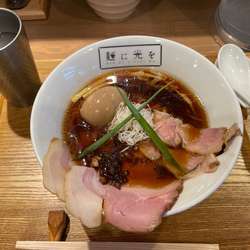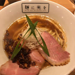 濃い醤油色のスープに鴨チャーシュー、穂先メンマ、ネギ、味玉。