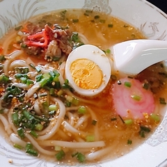 りんくるそばは、人気の三枚肉と油淋鶏風甘だれチキンが乗っています。